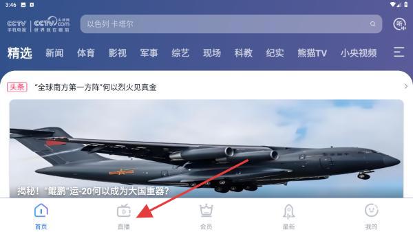 1、打開cctv手機(jī)電視APP,進(jìn)入到首頁點(diǎn)擊導(dǎo)航欄中直播的圖標(biāo)。
