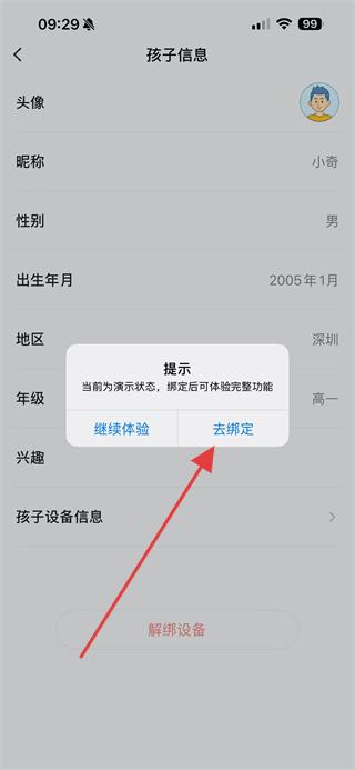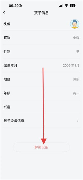 3、在孩子信息頁面,點擊解綁設(shè)備按鈕。