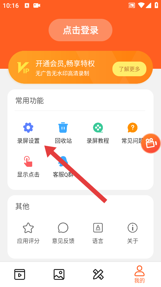 2、在個(gè)人頁(yè)面的常用功能區(qū)域,點(diǎn)擊錄屏設(shè)置選項(xiàng),進(jìn)入錄屏設(shè)置頁(yè)面。