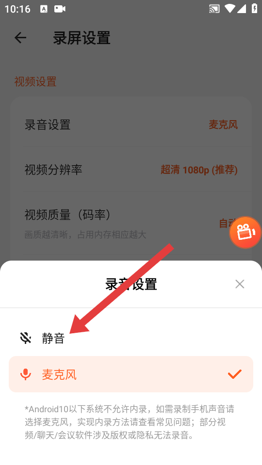 4、在錄音設(shè)置選擇框中,點(diǎn)擊靜音的選項(xiàng),完成靜音模式設(shè)置。