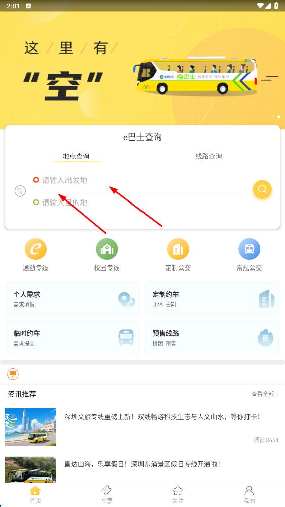 2、登錄后返回首頁,在“e巴士查詢”區(qū)域,若選“地點(diǎn)查詢”,依次輸入出發(fā)地和目的地進(jìn)行查詢。
