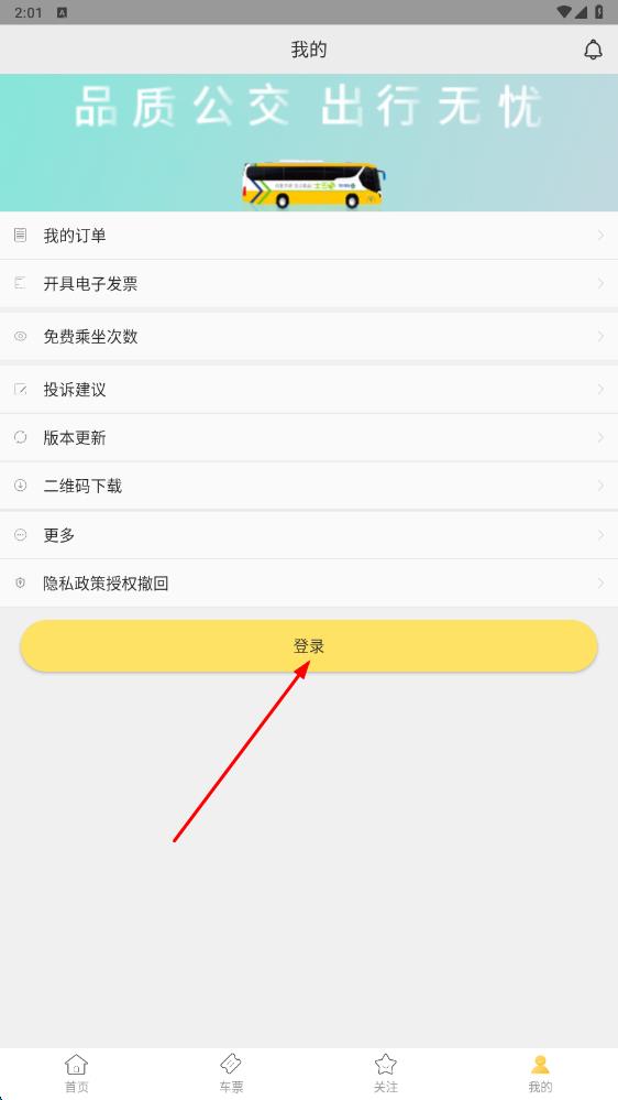 1、打開e巴士軟件,進(jìn)入“我的”頁面,點(diǎn)擊黃色“登錄”按鈕完成登錄,以便使用完整功能。