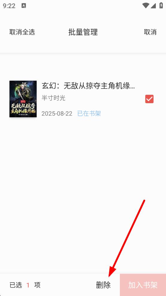 3、在批量管理界面勾選要?jiǎng)h除閱讀記錄的書籍,點(diǎn)擊下方刪除按鈕完成操作。