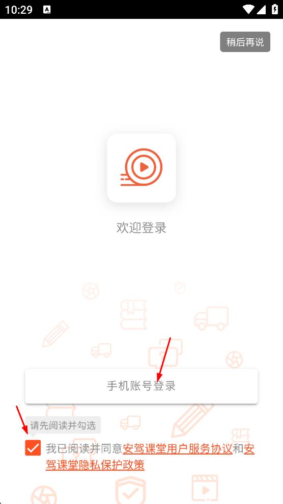2、進入登錄頁面,勾選“我已閱讀并同意安駕課堂用戶服務(wù)協(xié)議和安駕課堂隱私保護政策”,點擊“手機賬號登錄”按鈕。