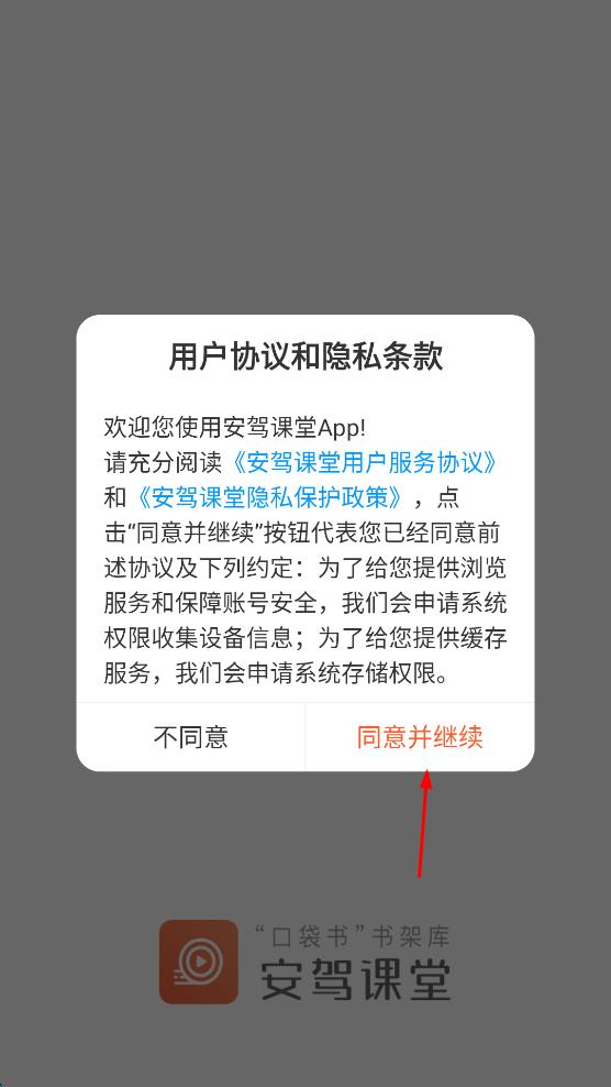 1、打開安駕課堂App,在彈出的用戶協(xié)議和隱私條款頁面,點擊“同意并繼續(xù)”按鈕。