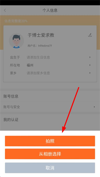 4、在彈出的選項(xiàng)中,選擇拍照或從相冊選擇,即可更換頭像照片。