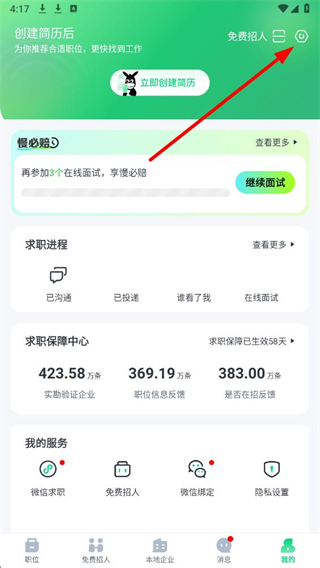 1、打開趕集招聘app,進(jìn)入個人頁面,點(diǎn)擊右上角設(shè)置圖標(biāo)。