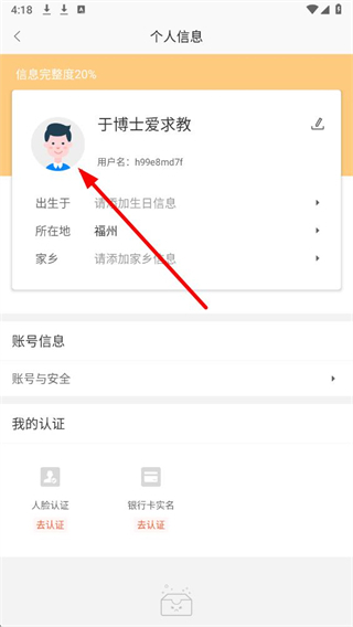 3、在個人信息頁面,點(diǎn)擊頭像區(qū)域,進(jìn)入更換頭像操作。