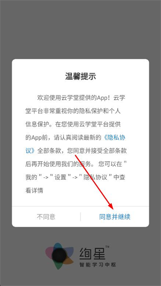 1、打開絢星app,在彈出的提示框中點擊同意并繼續(xù)。