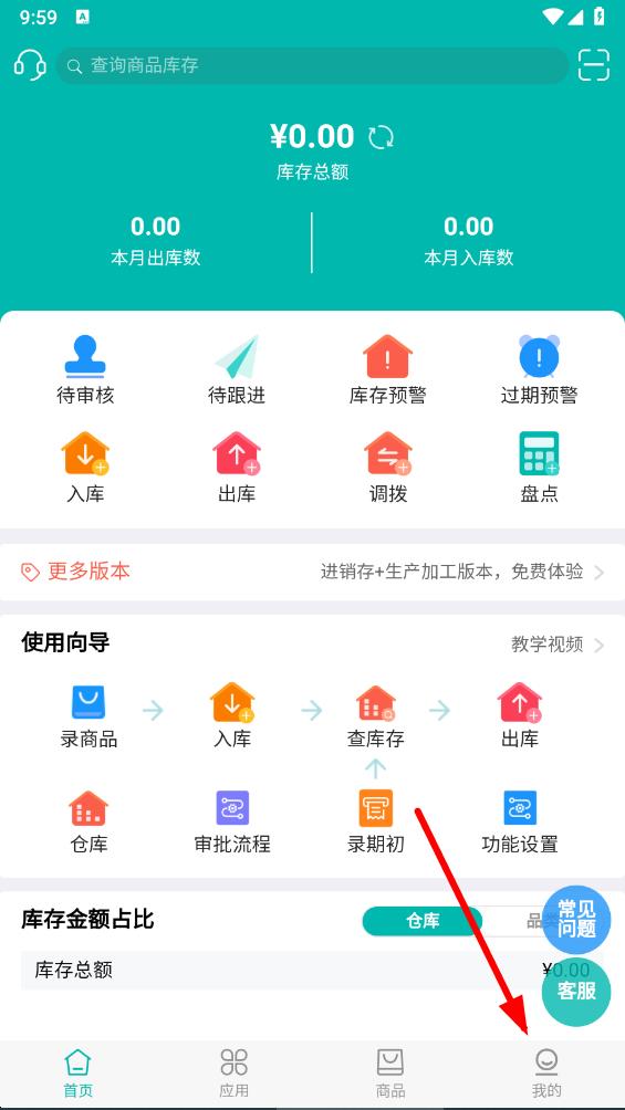 1、打開智能云倉(cāng)庫(kù)存管理應(yīng)用,點(diǎn)擊底部導(dǎo)航欄中的我的圖標(biāo),進(jìn)入個(gè)人相關(guān)設(shè)置界面。