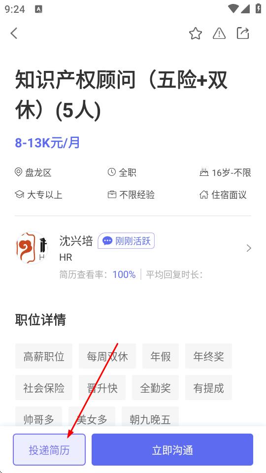 2、在職位詳情頁面,找到并點(diǎn)擊投遞簡歷按鈕。