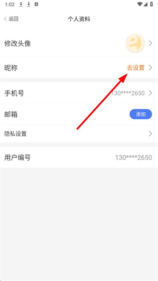 3、在個(gè)人資料頁(yè)面,找到昵稱選項(xiàng),點(diǎn)擊右側(cè)去設(shè)置按鈕,進(jìn)入昵稱修改界面。