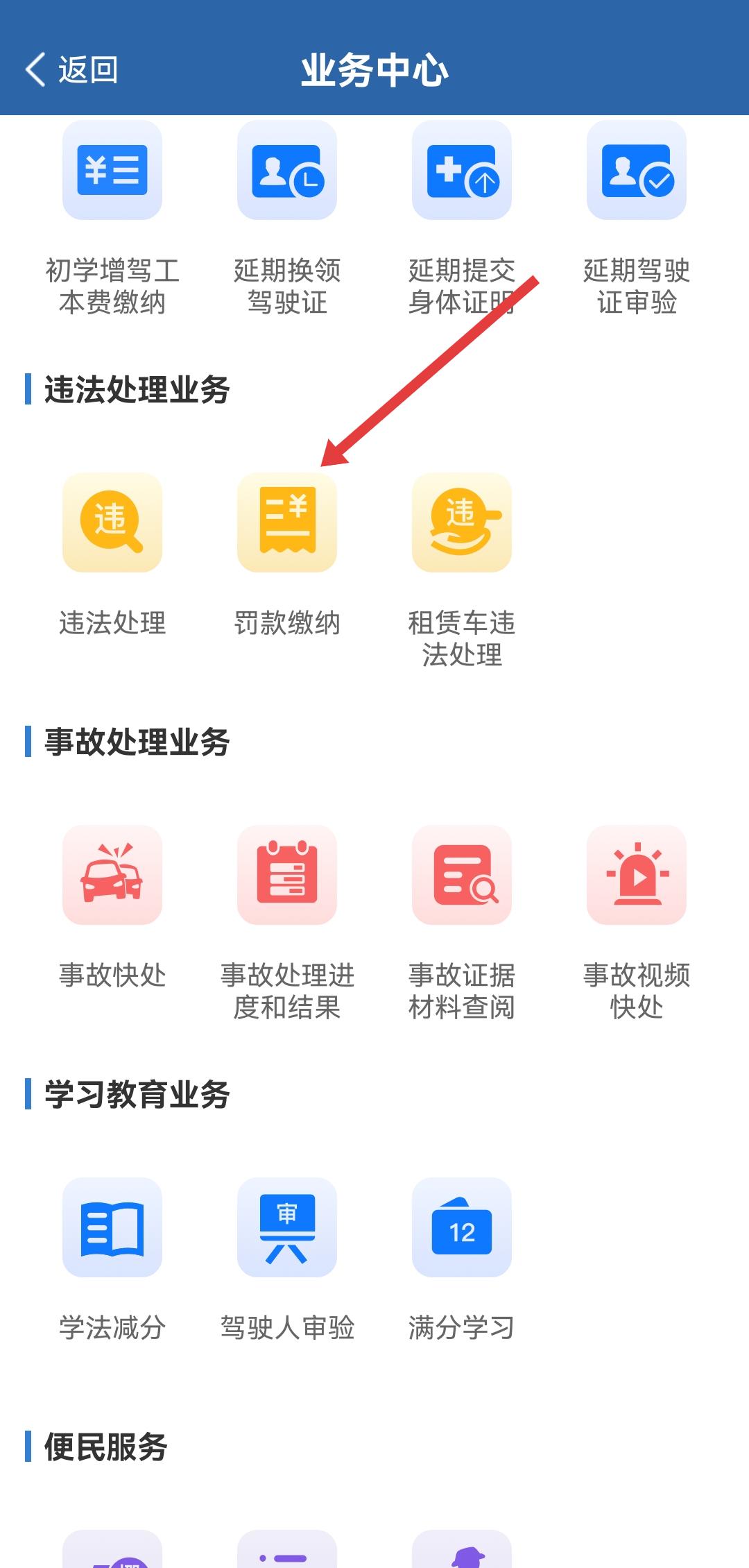 1、進(jìn)入交管12123的業(yè)務(wù)中心頁面,在違法處理業(yè)務(wù)模塊中點(diǎn)擊罰款繳納選項(xiàng),進(jìn)入罰款繳納界面。