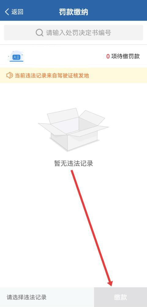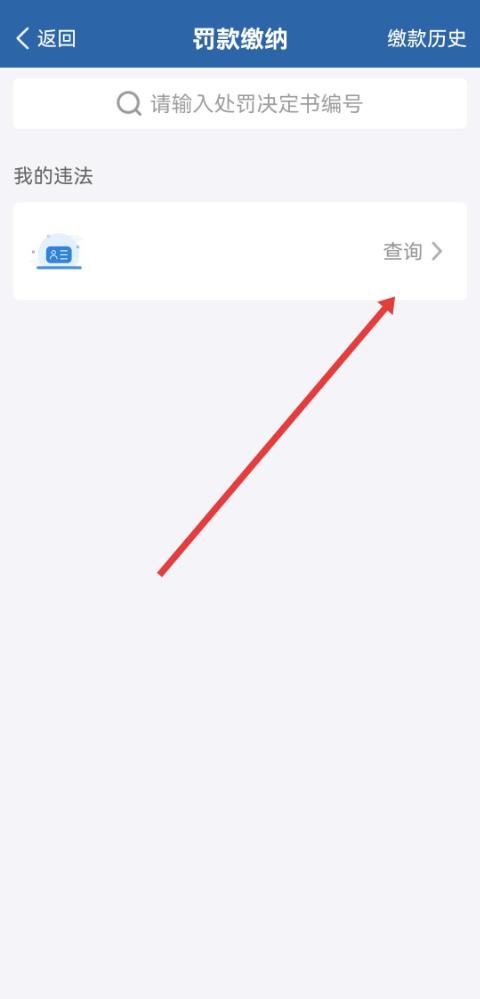 2、在罰款繳納的頁面,需要點(diǎn)擊我的違法下方的信息欄右側(cè)查詢的按鈕,獲取待繳罰款的記錄。