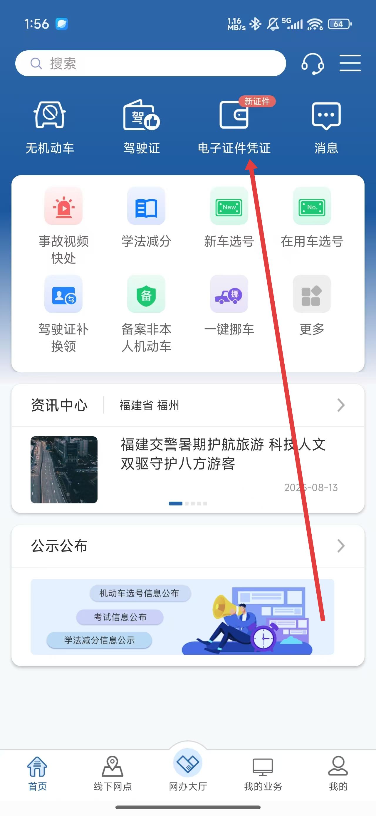 1、點擊主頁面中的電子證件憑證按鈕,進入查看相關服務信息。