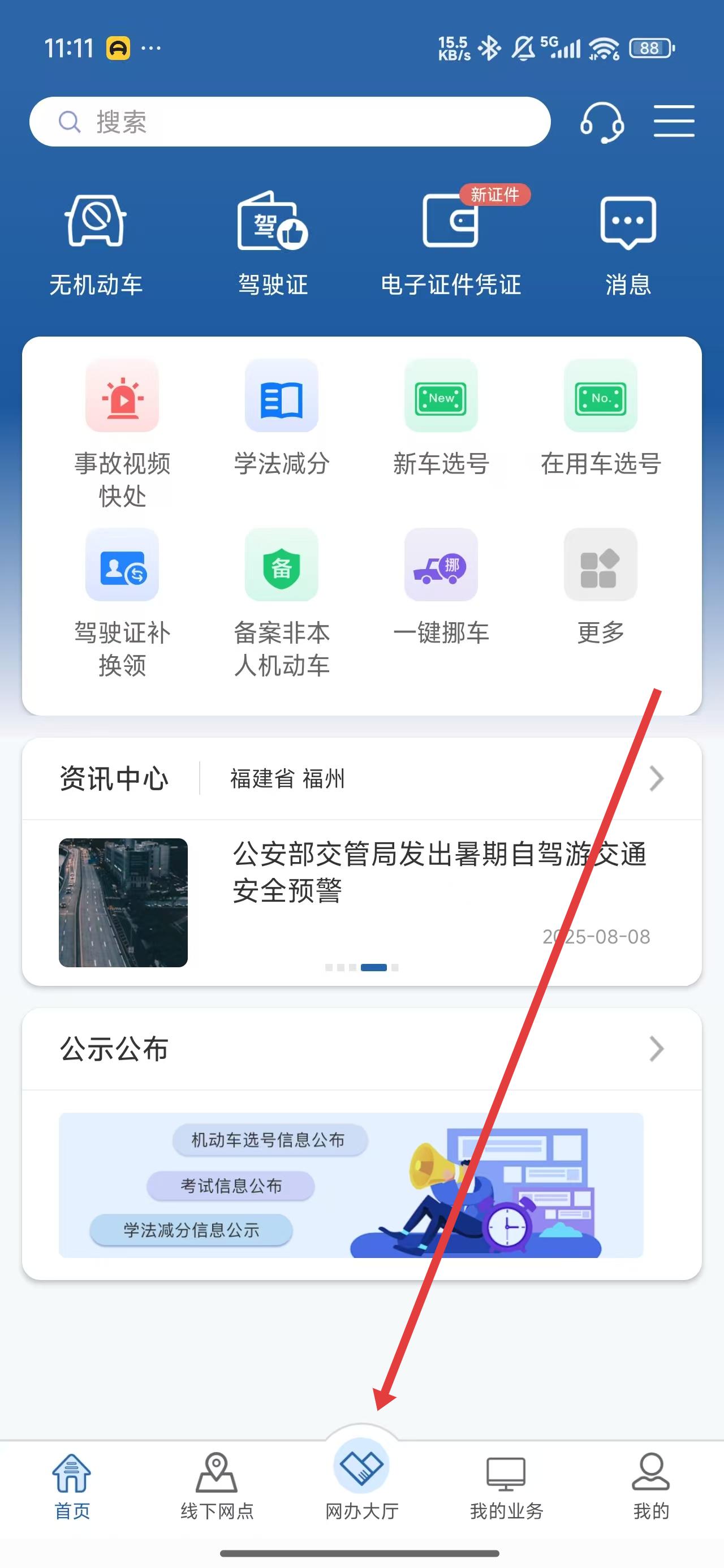 1、在交管12123app主頁面中點(diǎn)擊頂部的網(wǎng)辦大廳按鈕,進(jìn)入查看業(yè)務(wù)辦理。