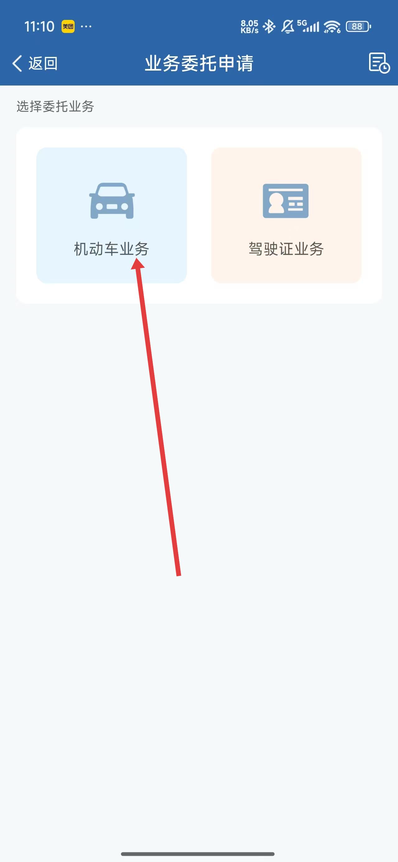 3、在業(yè)務(wù)委托申請頁面中,可以選擇機(jī)動(dòng)車業(yè)務(wù)點(diǎn)擊進(jìn)入辦理操作。