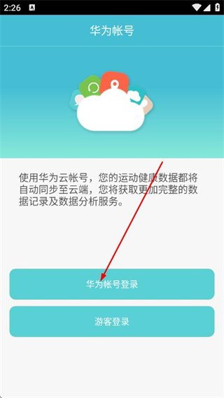 1、打開(kāi)榮耀暢玩手環(huán)APP,點(diǎn)擊華為帳號(hào)登錄選項(xiàng)。