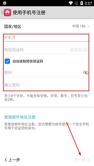 3、輸入手機(jī)號(hào)、短信驗(yàn)證碼,設(shè)置密碼并確認(rèn)密碼,點(diǎn)擊下一步,完成注冊(cè)。