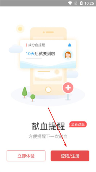 1、在今日獻血的獻血提醒頁面,點擊登陸/注冊。
