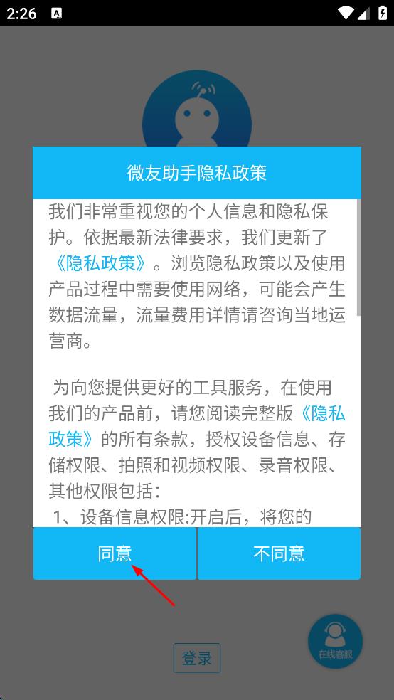 1、打開微友助手軟件,在彈出的隱私政策提示框中點擊同意。