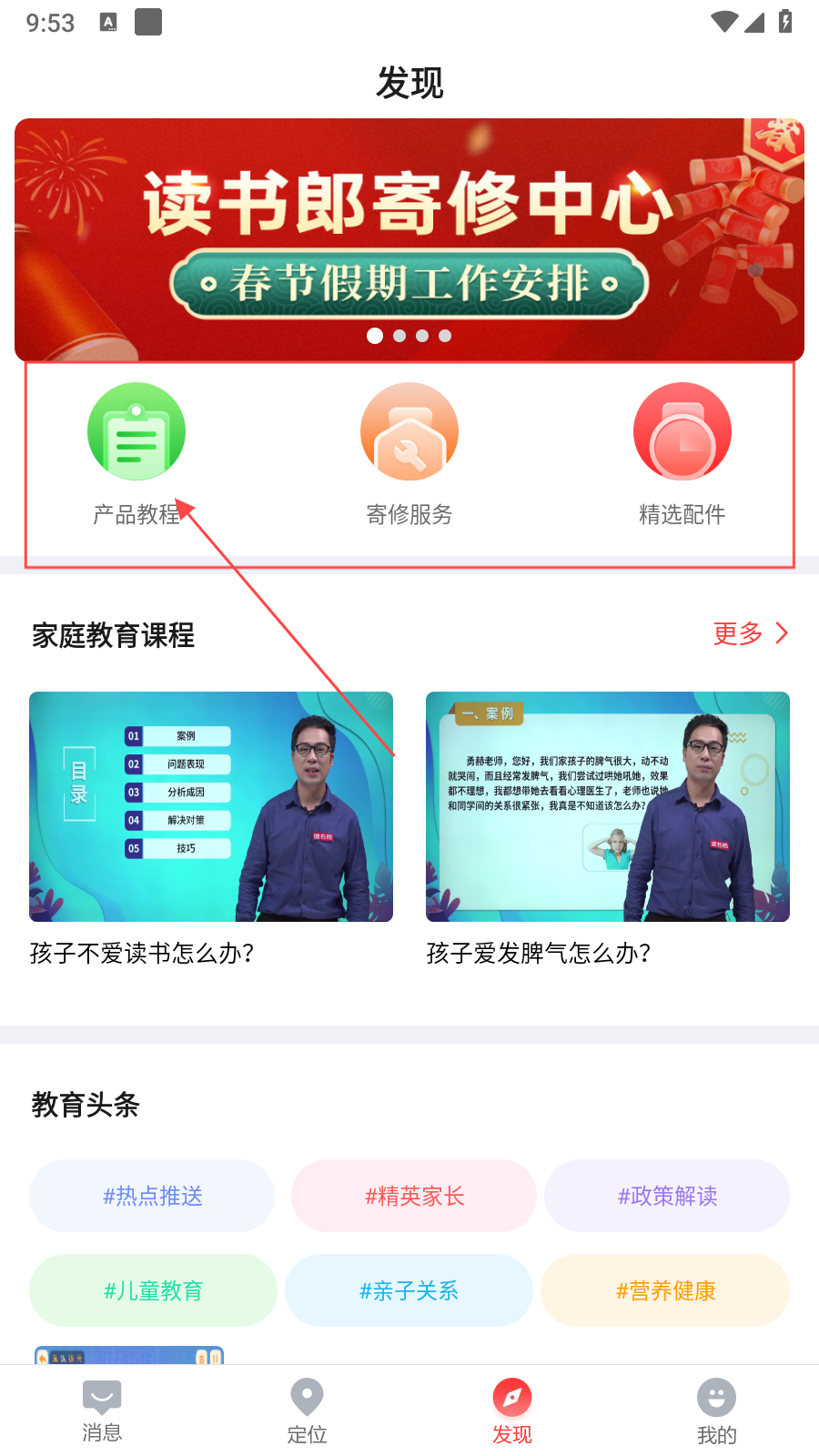 1、打開讀書郎應(yīng)用,進(jìn)入下方的發(fā)現(xiàn)頁面,點(diǎn)擊產(chǎn)品教程圖標(biāo),進(jìn)入產(chǎn)品教程選擇界面。
