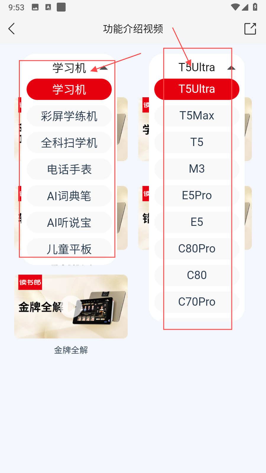 2、在功能介紹視頻界面,通過點(diǎn)擊左上角學(xué)習(xí)機(jī)下拉菜單,選擇具體的產(chǎn)品類別,再點(diǎn)擊右上角的產(chǎn)品型號(hào)下拉菜單,選擇對(duì)應(yīng)的型號(hào)。