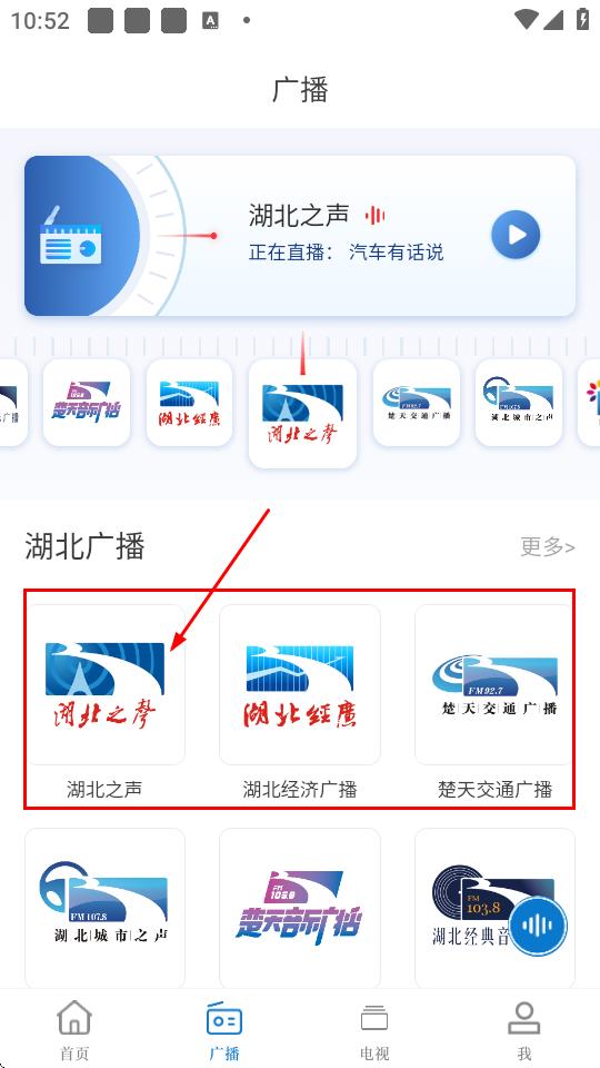 2、在廣播頁面,選擇想要回聽節(jié)目的對應電臺,如湖北之聲。