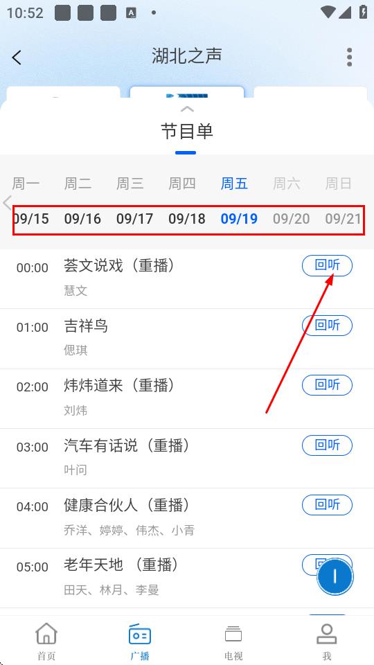 3、進入電臺頁面后,選擇節(jié)目日期,并點擊想要回聽節(jié)目右側的回聽按鈕。