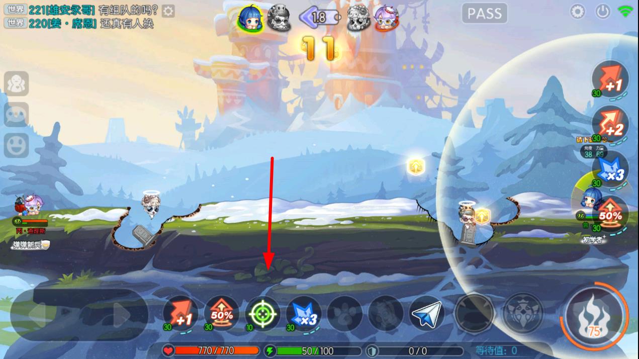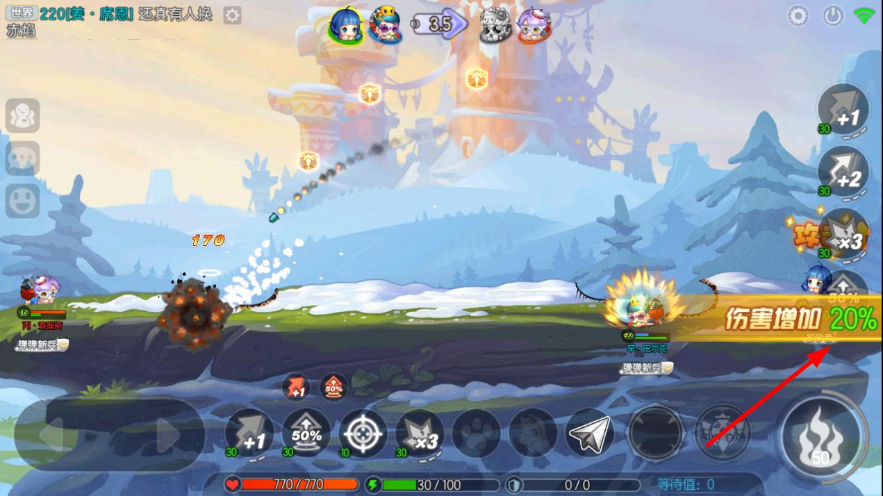3、點擊屏幕下方的增益?zhèn)D標增加攻擊力,點擊發(fā)射按鈕,即可增加傷害,此時發(fā)射炮彈能打出更高的傷害。