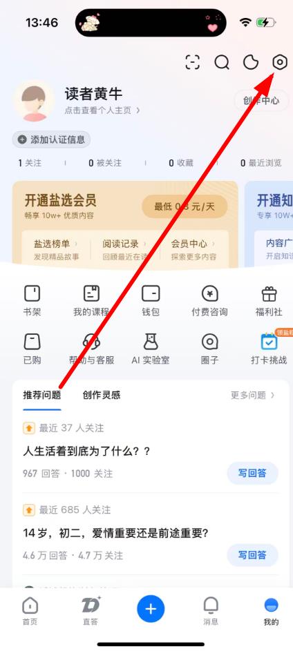 1、點擊知乎我的頁面右上角設(shè)置圖標(biāo)進入設(shè)置界面。