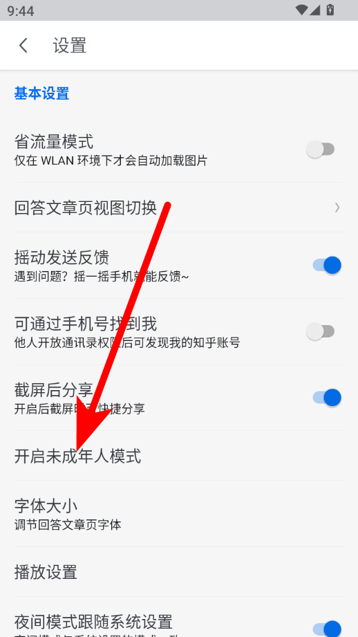 3、在設(shè)置頁面,點擊開啟未成年人模式選項,進入未成年人模式說明界面。
