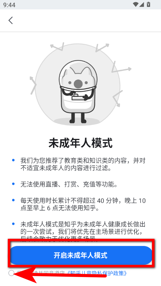 4、在未成年人模式說明界面,勾選同意協(xié)議后點擊開啟未成年人模式按鈕,完成知乎未成年模式開啟操作。
