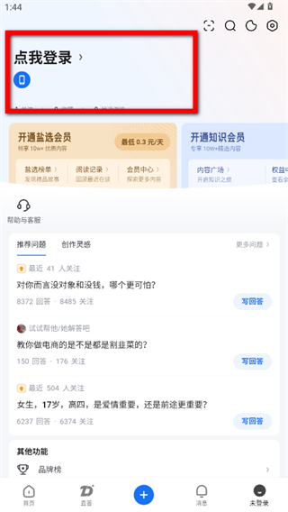 1、在知乎首頁,點擊右下角未登錄選項,進入個人中心頁面。