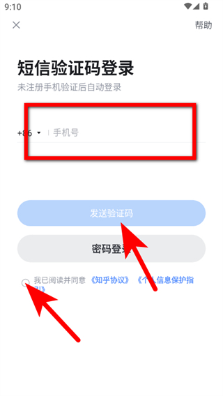 3、在登錄頁面,輸入手機號勾選協(xié)議后點擊發(fā)送驗證碼,進入驗證碼輸入界面。
