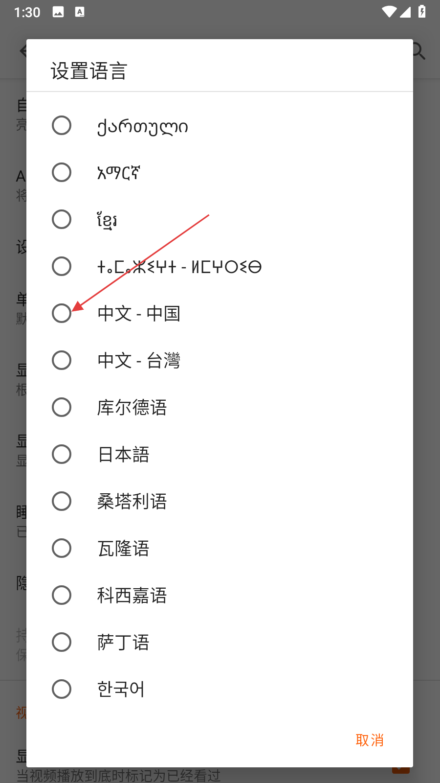 4、在彈出的語言選擇列表里,選擇中文-中國,隨后重啟VLC播放器,界面即可切換為中文。