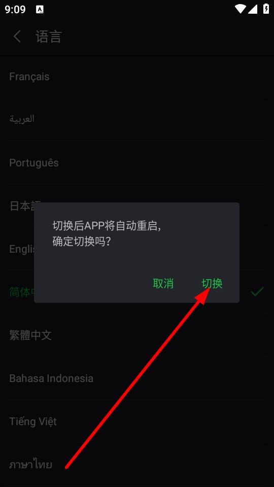 4、選擇后會彈出確認(rèn)提示框,點(diǎn)擊切換APP會自動重啟,重啟后即完成語言切換。