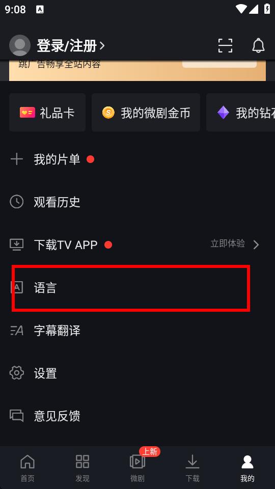 2、在個人頁面下滑找到語言選項(xiàng),點(diǎn)擊進(jìn)入語言設(shè)置界面。