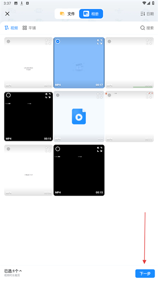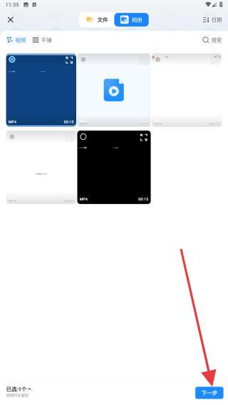 2、在選擇視頻的頁(yè)面內(nèi),在相冊(cè)下選擇后再點(diǎn)擊下一步,