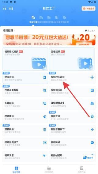 1、啟動(dòng)格式工廠的應(yīng)用,在首頁(yè)點(diǎn)擊視頻時(shí)長(zhǎng)裁剪的按鈕。