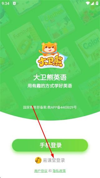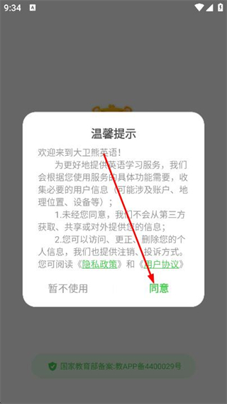 1、打開大衛(wèi)熊英語app,在彈出的窗口中點(diǎn)擊同意。