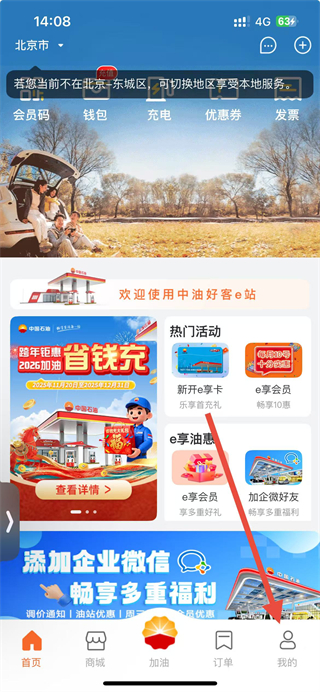 1、打開中油好客e站app進(jìn)入首頁,點(diǎn)擊底部導(dǎo)航欄中的加油按鈕,進(jìn)入加油相關(guān)頁面。