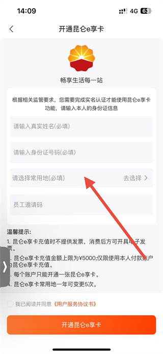 4、在開通頁面填寫真實(shí)姓名、身份證號(hào)碼等必填信息,勾選協(xié)議后點(diǎn)擊開通昆侖e享卡完成操作。