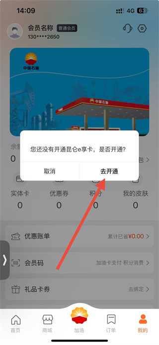 3、在彈出的提示框中,選擇去開通按鈕,進(jìn)入昆侖e享卡的開通頁面。