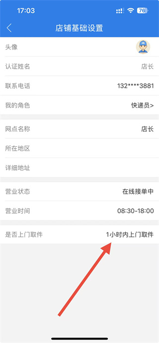 3、進(jìn)入店鋪基礎(chǔ)設(shè)置頁面后,點擊是否上門取件選項。