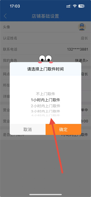 4、在上門取件時間選擇頁面,選擇需要的取件時間后點擊確定即可完成修改操作。