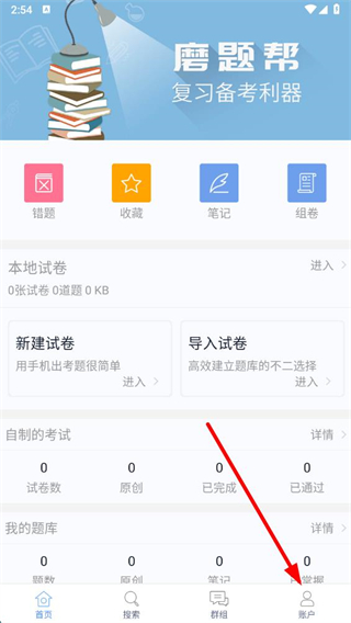 1、打開磨題幫app,點擊底部導(dǎo)航欄中的賬戶選項,進入賬戶相關(guān)頁面。