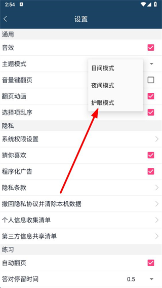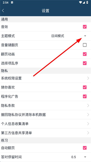 3、在設(shè)置界面中,找到主題模式選項,點擊其右側(cè)的下拉箭頭。