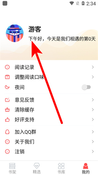 1、在全民追書我的頁面,點(diǎn)擊游客區(qū)域,進(jìn)入登錄頁面。