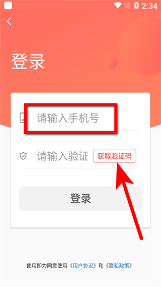 2、在登錄頁面,輸入手機(jī)號(hào),點(diǎn)擊獲取驗(yàn)證碼按鈕。